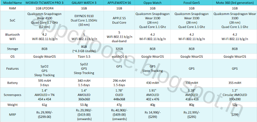This page is dedicated to list the specs of Mobovi Ticwatch Pro 3, Galaxy Watch 3, Apple Watch Series 6, Oppo Watch, Fossil Gen5 and Moto 360 (3rd generation) . This page will be updated as and when we receive new info about these devices.